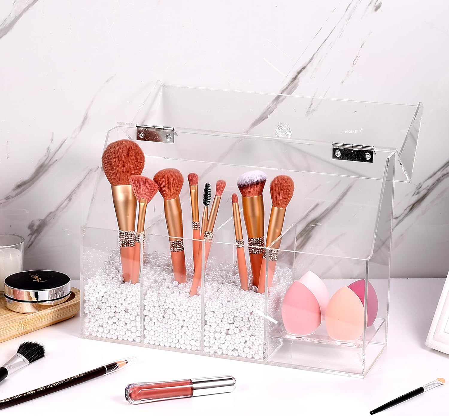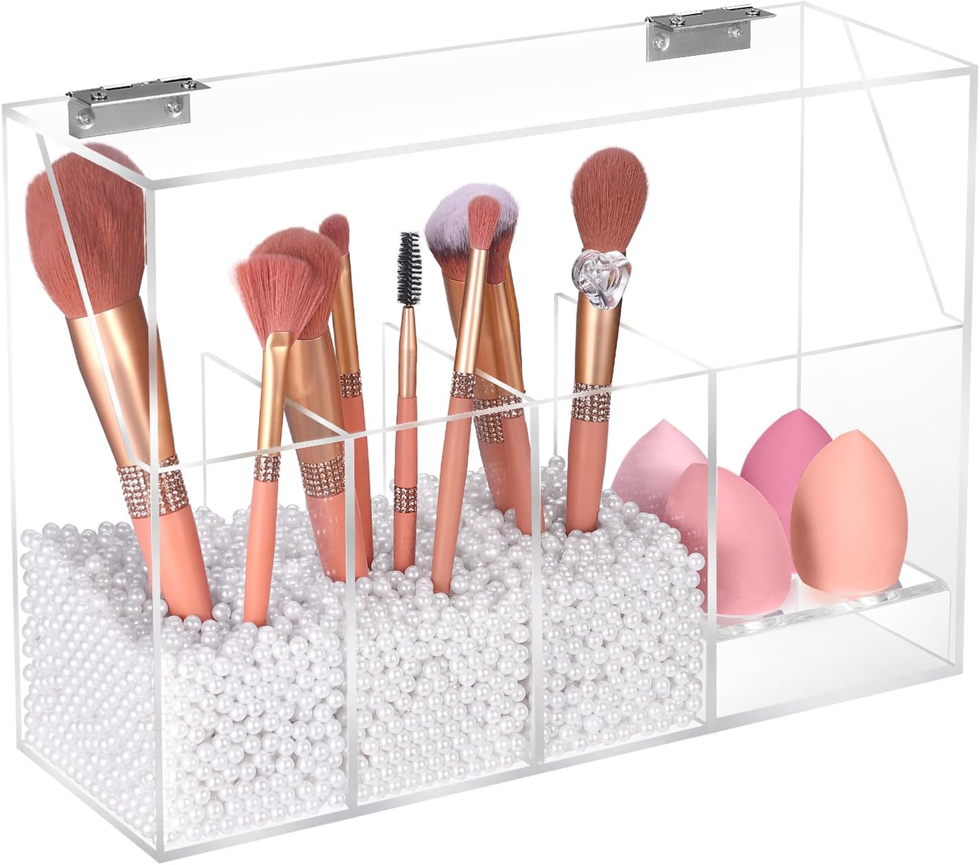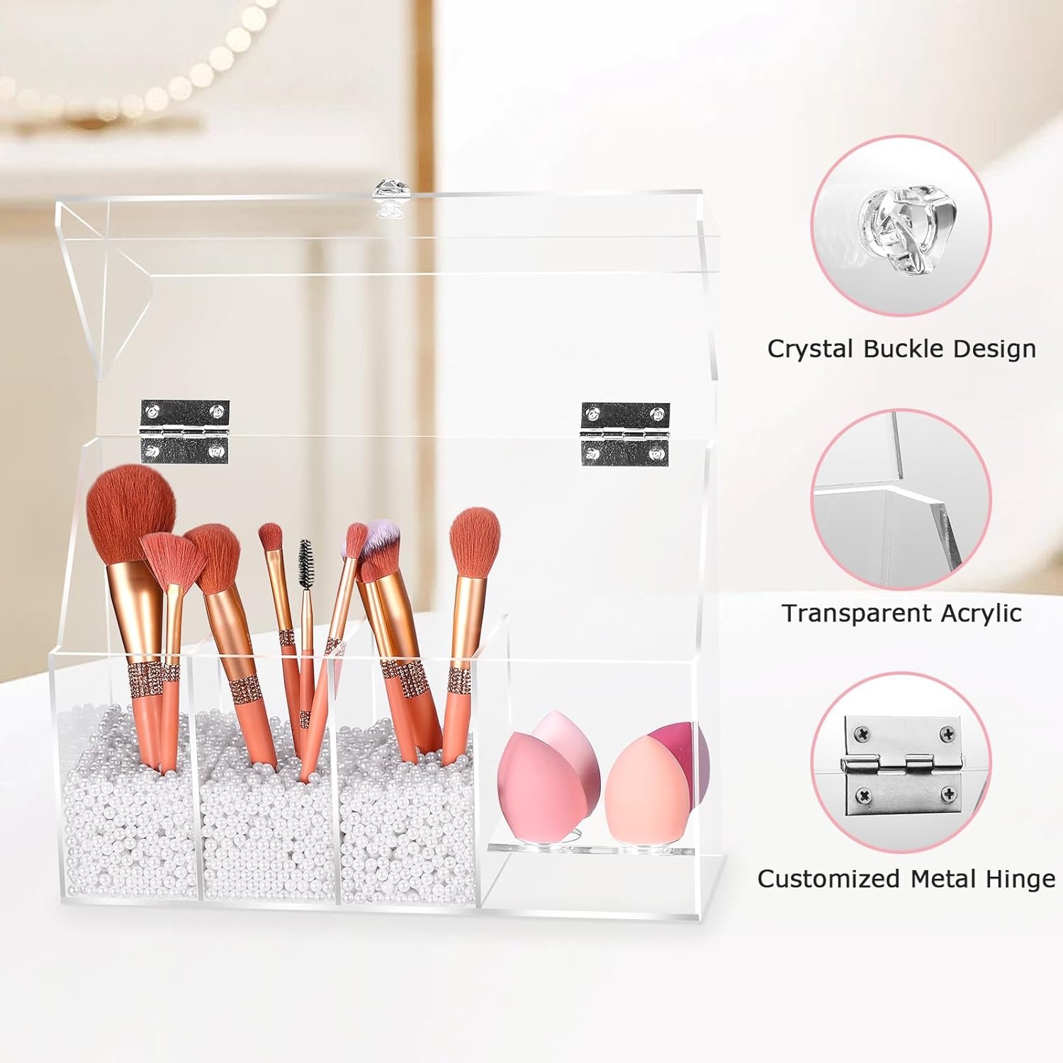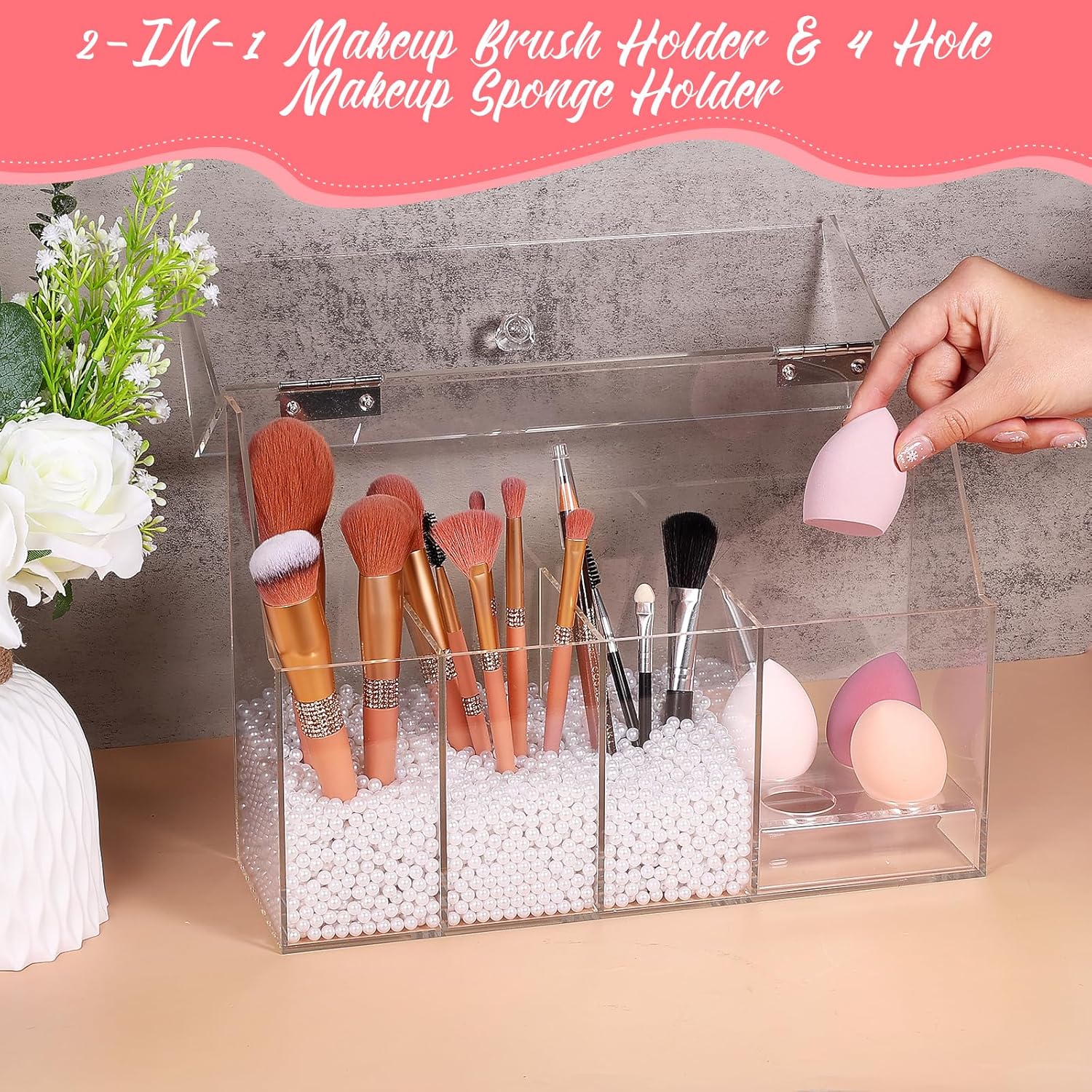 FANASSYY 2-in-1 3-Slots Makeup Brush Holder & Makeup Sponge Holder with Dustproof Lid – Acrylic Makeup Brush Organizer, Cosmetic Storage Box for Bathroom, Bedroom, Countertop (PEARLS NOT INCLUDED)