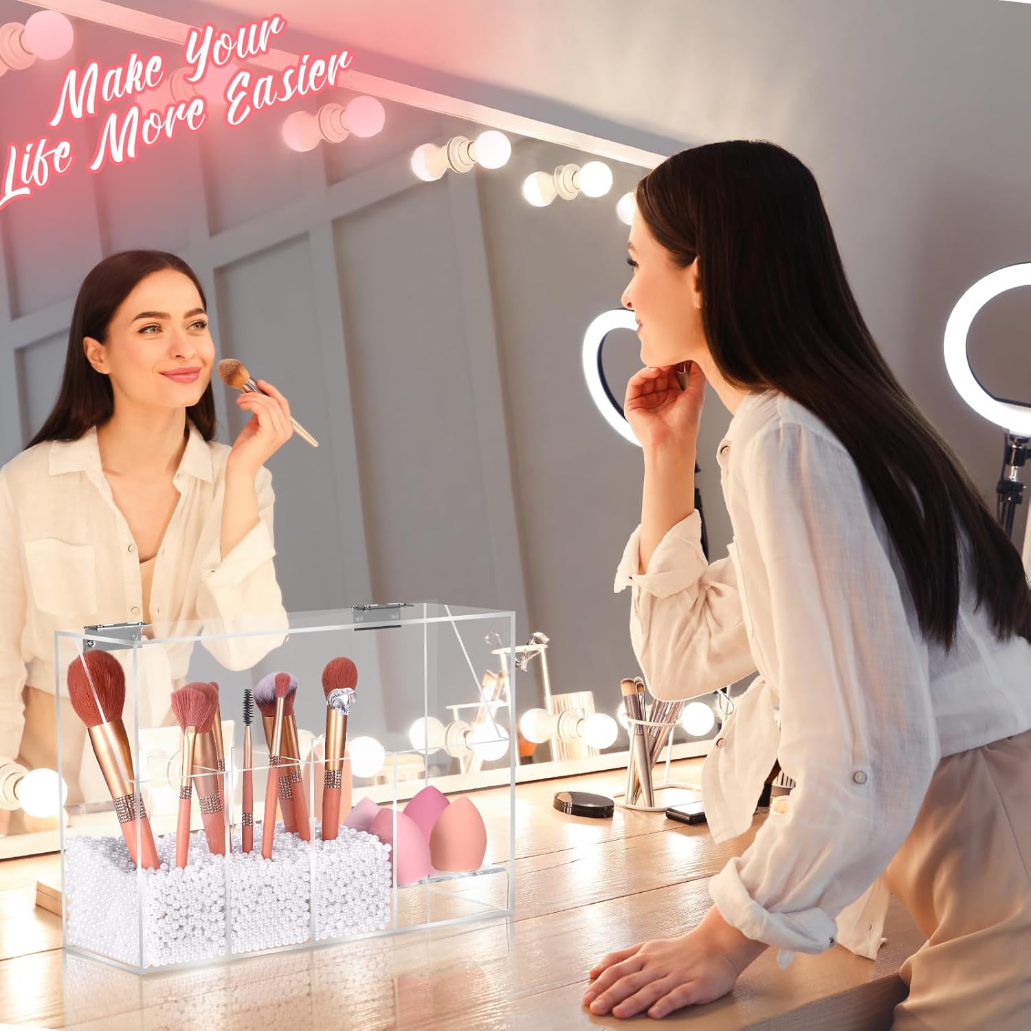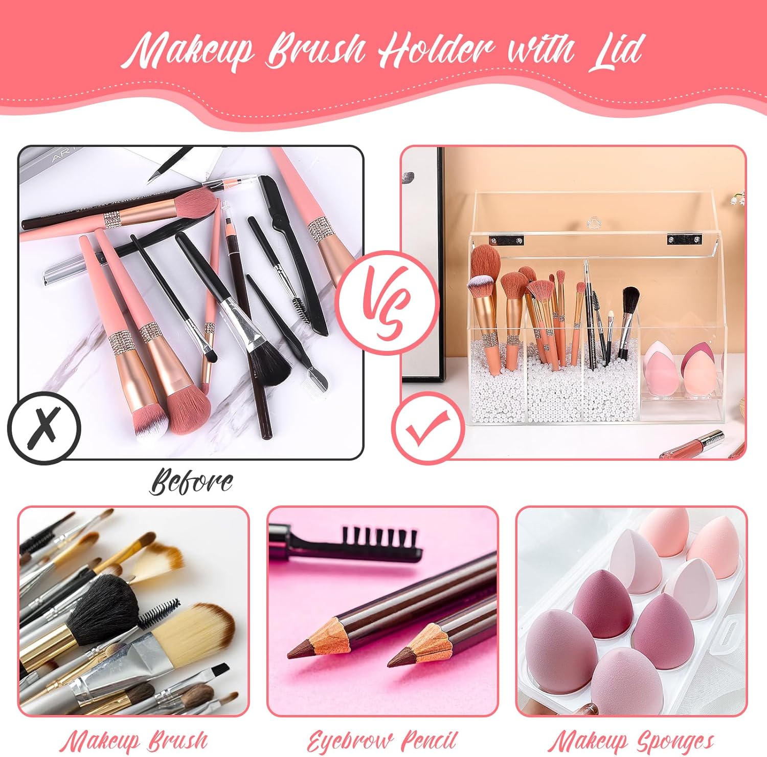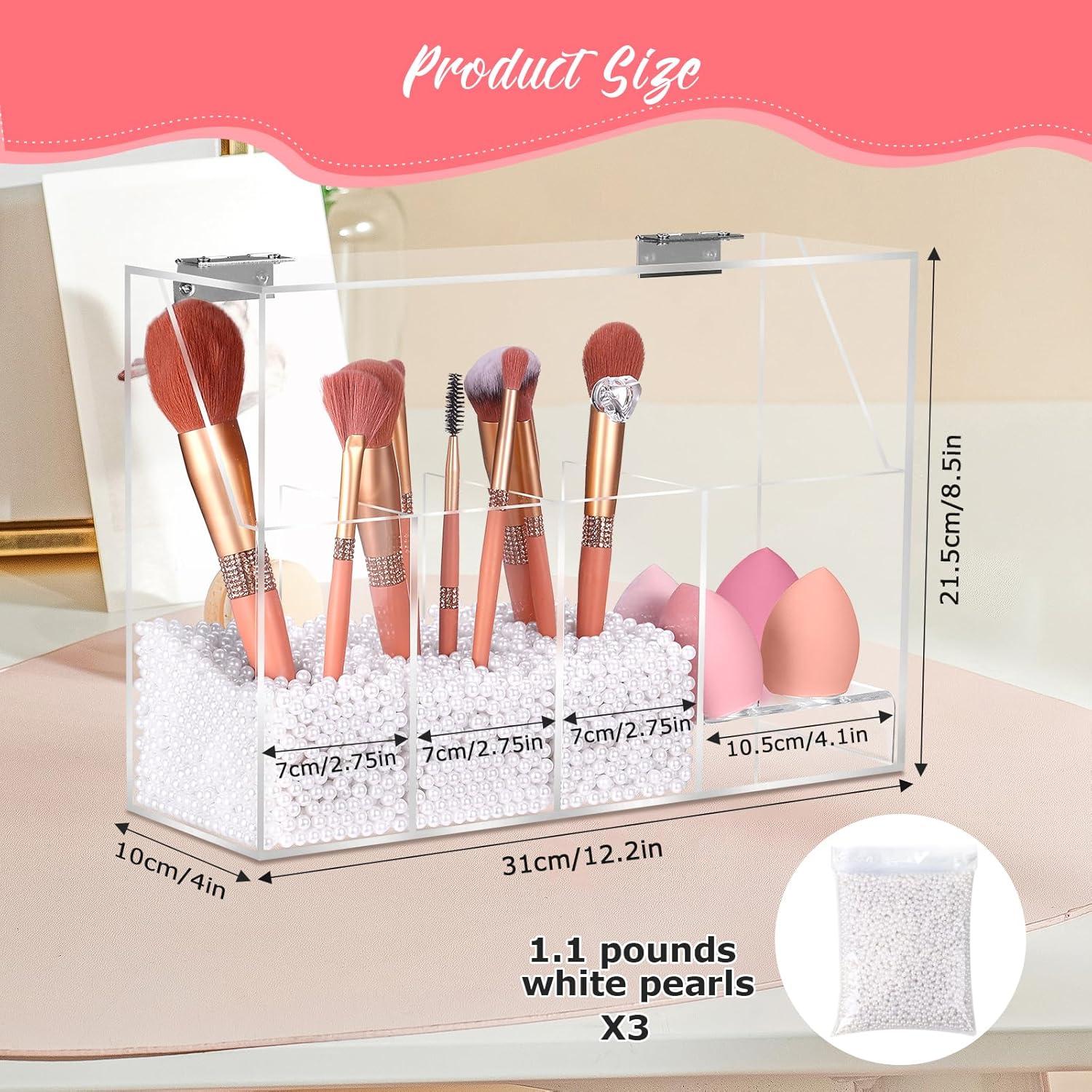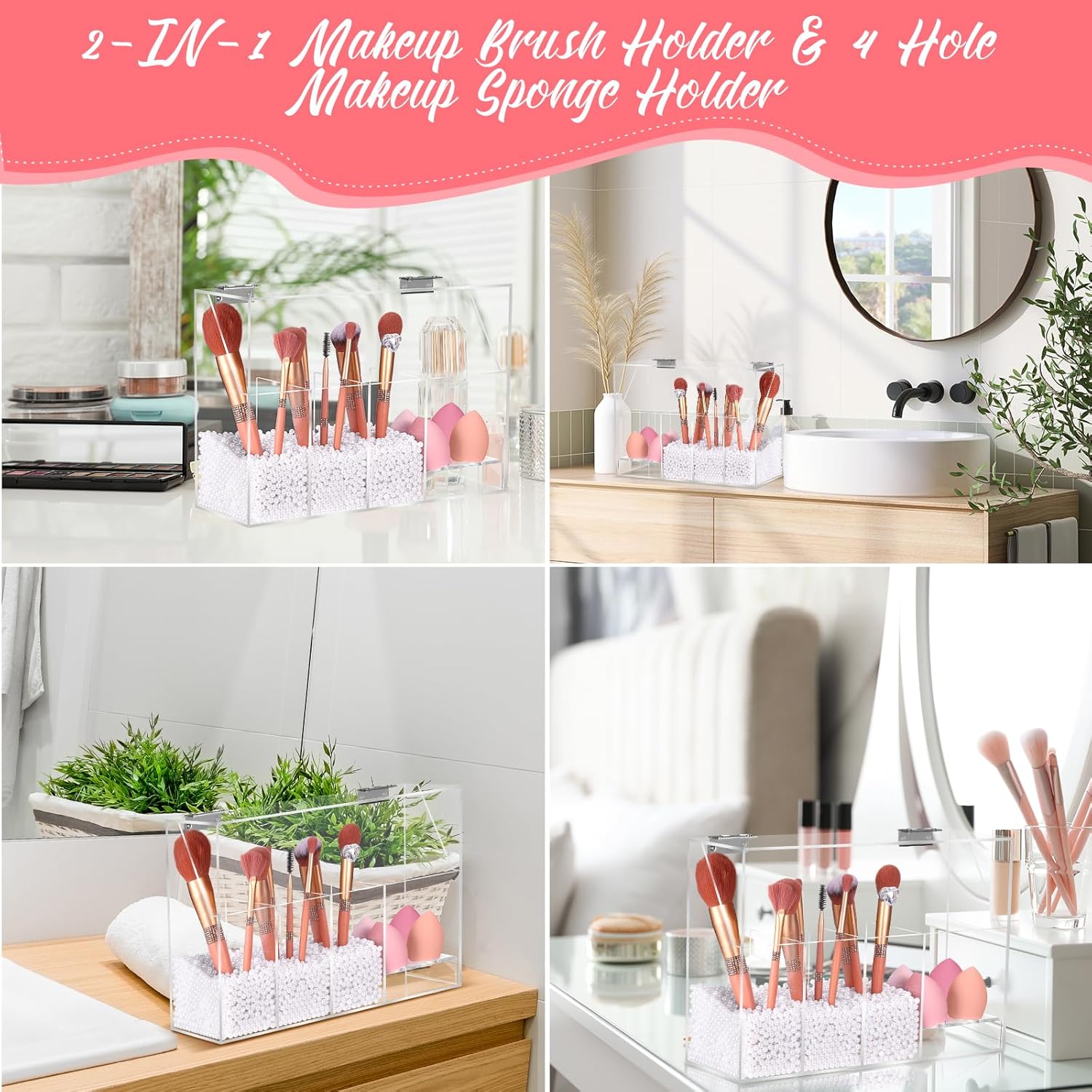 FANASSYY 2-in-1 3-Slots Makeup Brush Holder & Makeup Sponge Holder with Dustproof Lid – Acrylic Makeup Brush Organizer, Cosmetic Storage Box for Bathroom, Bedroom, Countertop (PEARLS NOT INCLUDED)