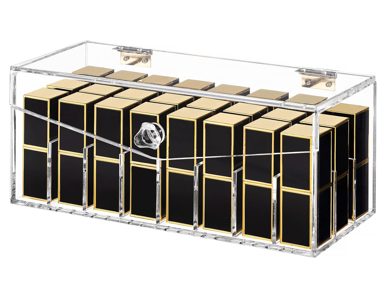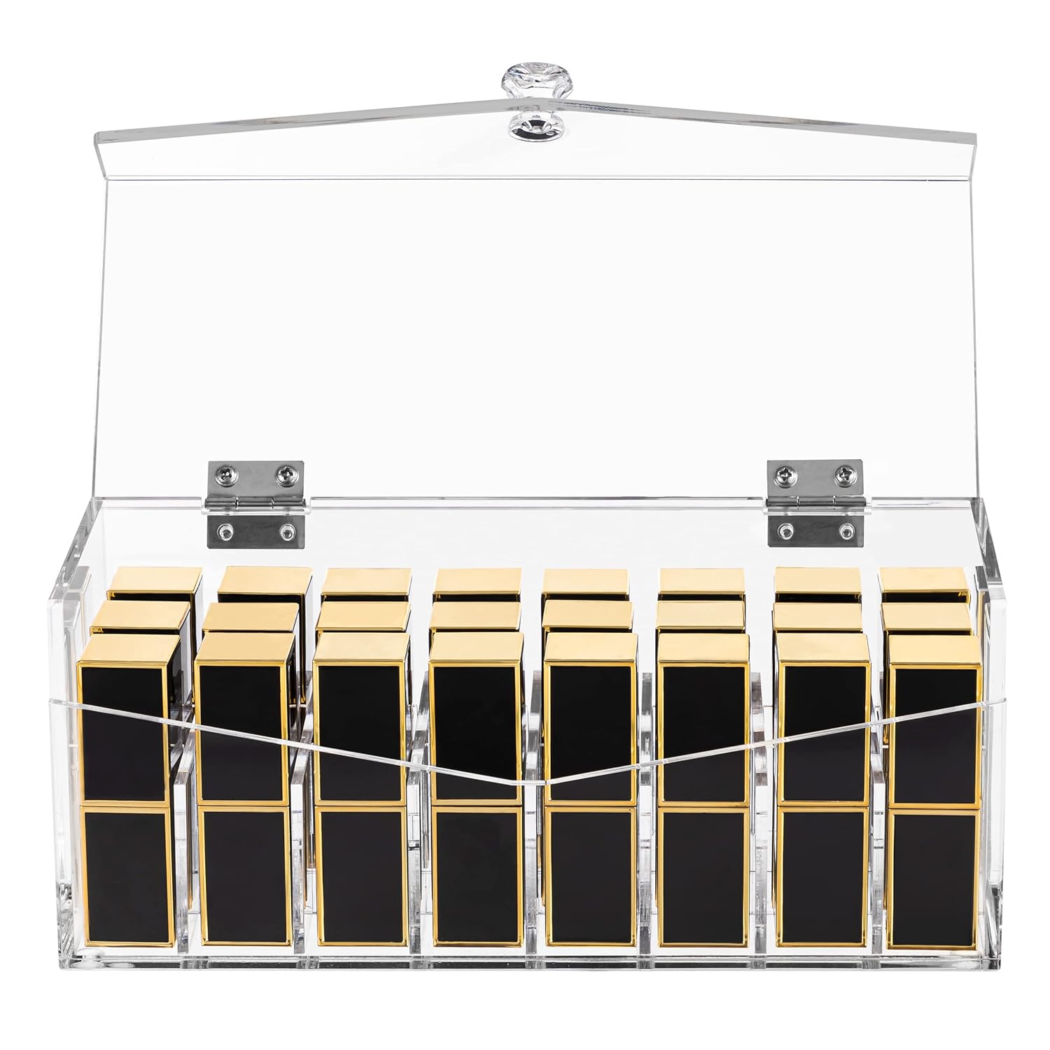 Fanassyy 24 Spaces Acrylic Lipstick Organizer with Lid, Dustproof Lipgloss Holder Case, Beauty Makeup Storage Cosmetic Organizer for Retail Shop, Women Dresser Vanity Countertop