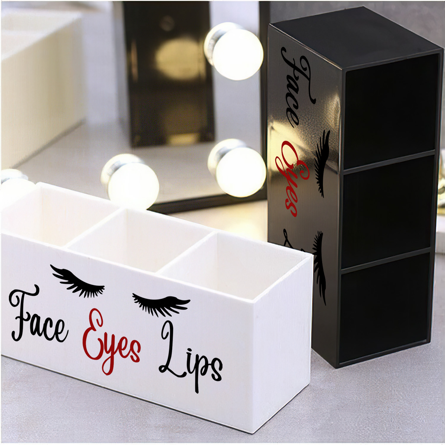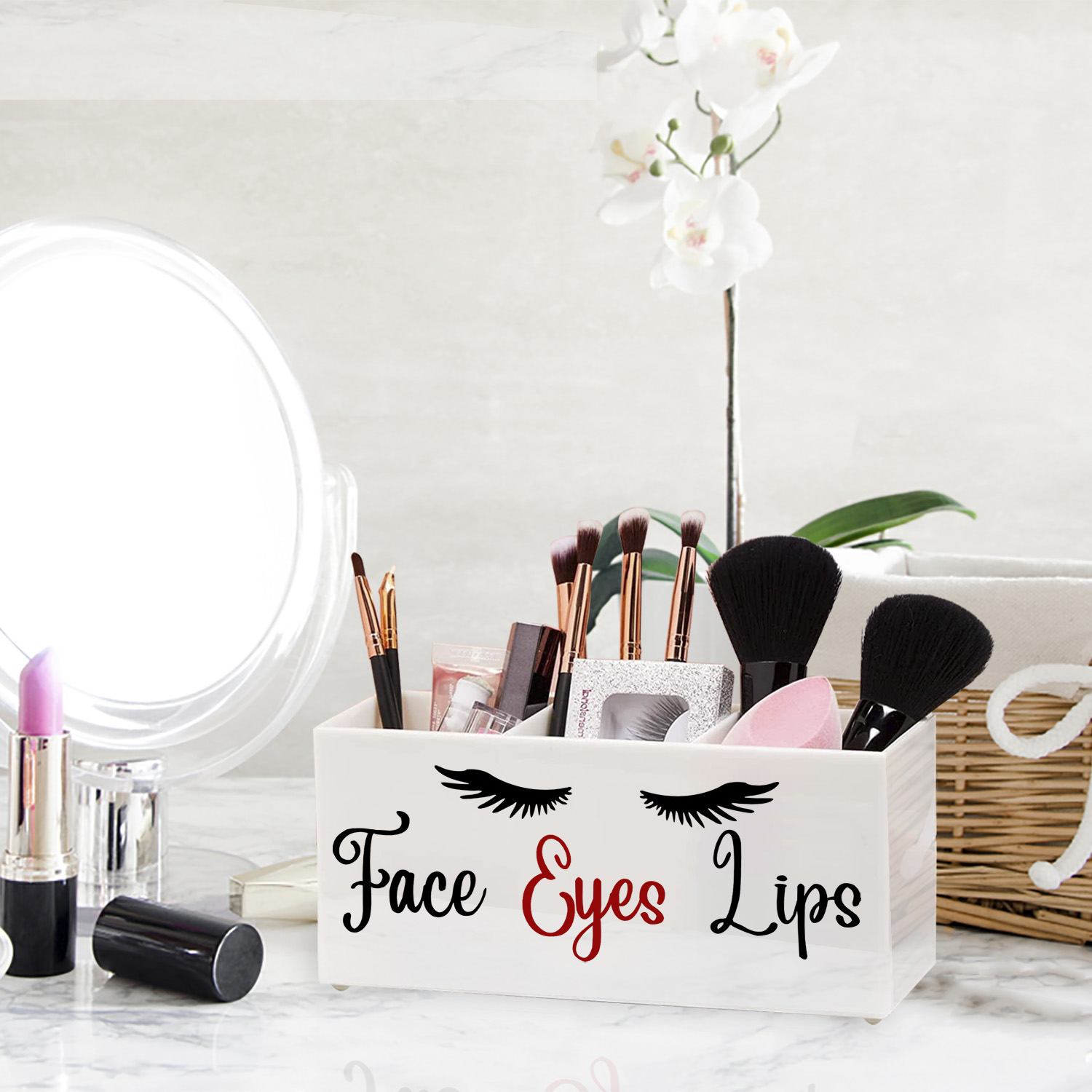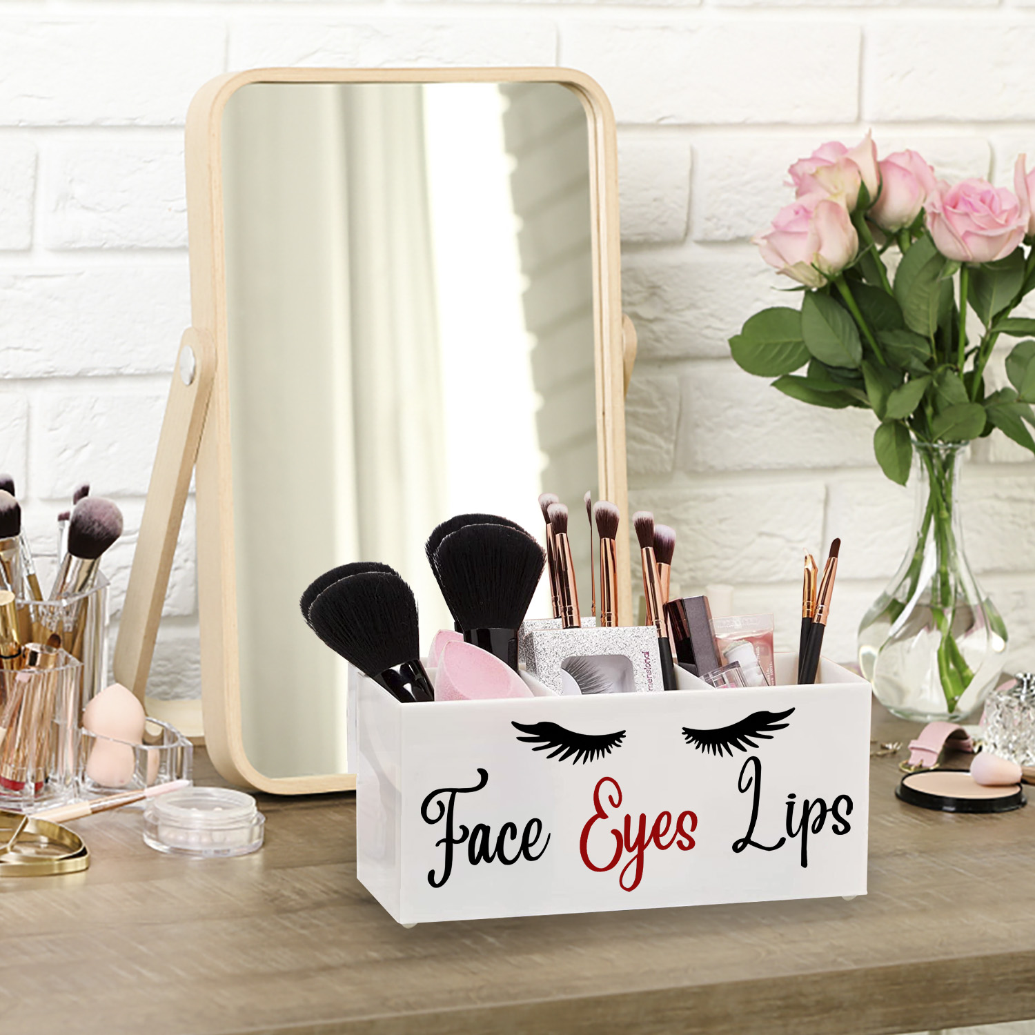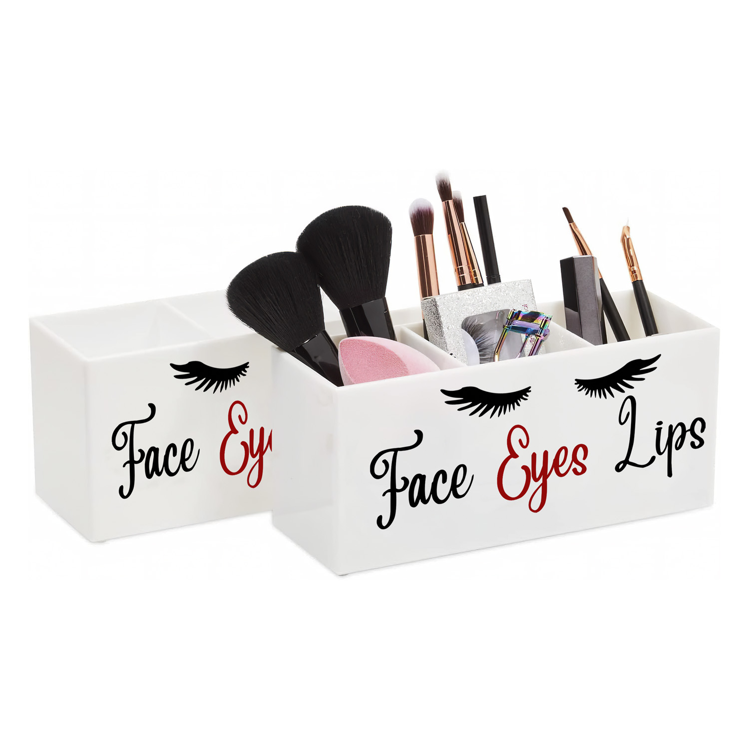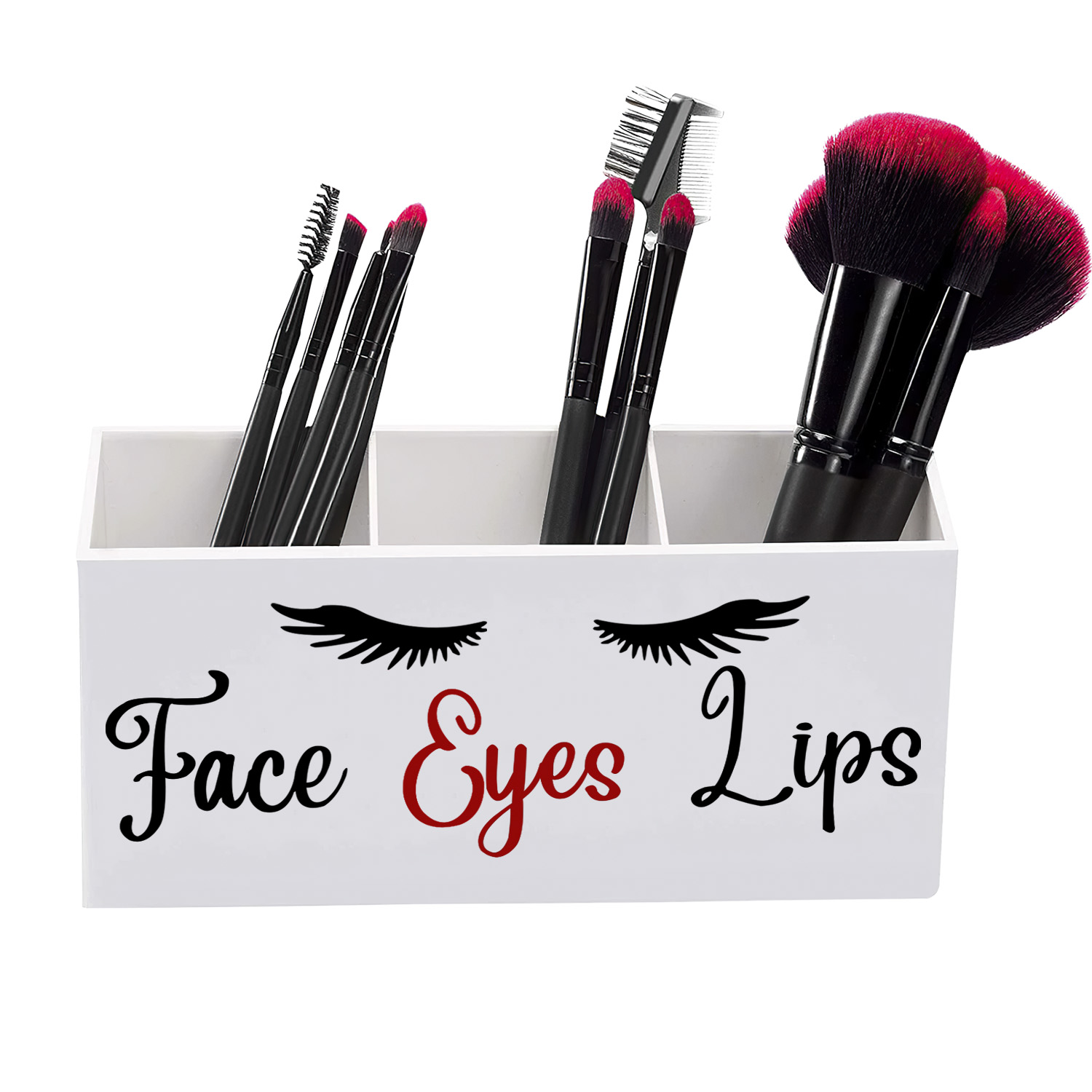FANASSYY 3-Slot Acrylic Makeup Brush Holder – Elegant Face, Eyes, and Lips Cosmetic Brush Organizer for Vanity Countertop (Design 1 with Modern Aesthetic)