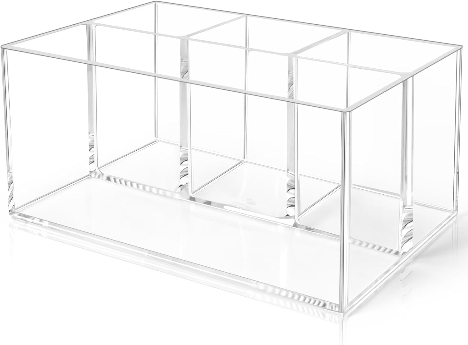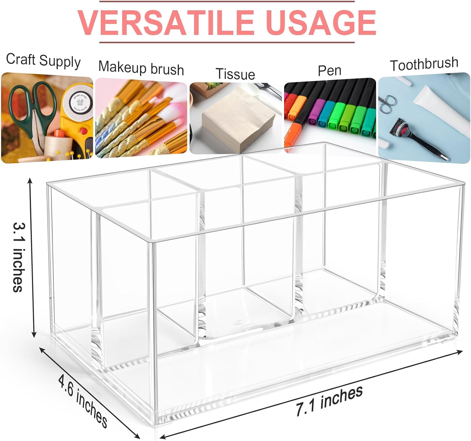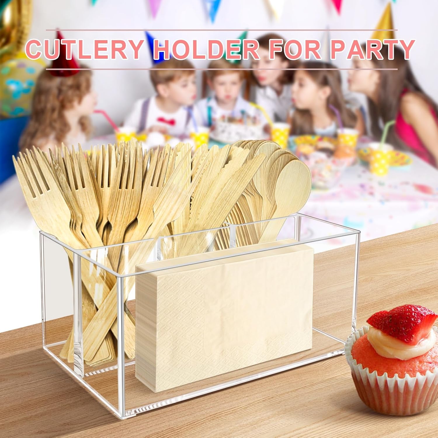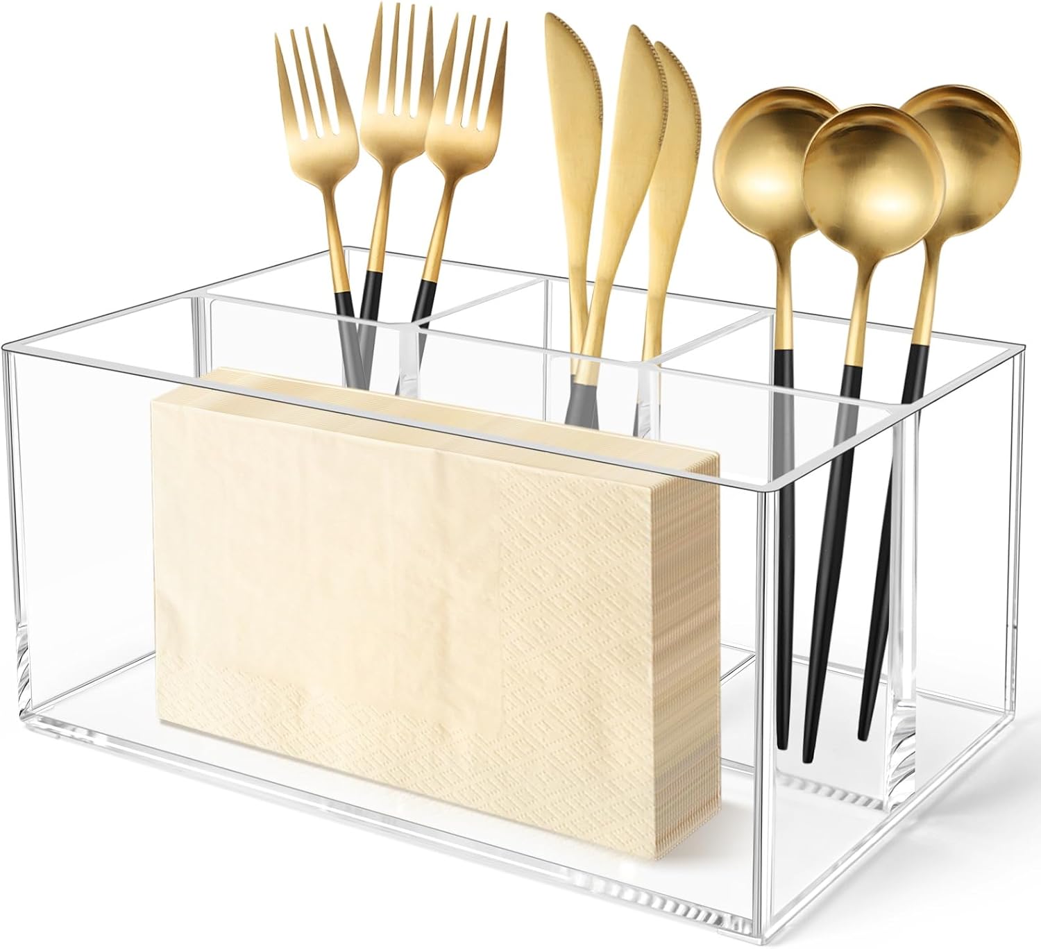 FANASSYY Acrylic Silverware Caddy – 4-Compartment Cutlery Holder, Tableware Storage Box for Napkin, Paper Plate, Knife, Spoon, and Fork Organizer